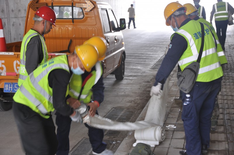 演練地點選擇在2021年汛期受災嚴重且具有典型代表的東海大道U型槽段。演練以模擬我市大部分地區(qū)出現(xiàn)強降水過程,省、市氣象部門發(fā)布暴雨紅色預警信號,市防汛指揮部通知啟動一級應急響應行動,東海大道U型槽段機動車道積水最深處達到30cm,車輛無法通行為背景。集團公司防汛指揮部接到險情信息后,迅速啟動應急預案,在U型槽路面最低處慢車道兩處雨水檢查井設置抽水泵,同時布置水帶繞過U型槽東側外墻至高位雨水檢查井,通過高位雨水管道將積水排放至山門河。