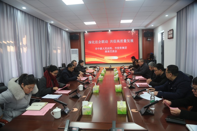 為進一步強化法企協(xié)同聯(lián)動,提升國有企業(yè)合規(guī)經(jīng)營水平,1月20日下午,市中級人民法院黨組成員、副院長杜俊峰等一行六人蒞臨市投資集團進行座談交流。市投資集團黨委書記、董事長、總經(jīng)理王敏及集團各業(yè)務部室、所屬公司負責人參加會議。